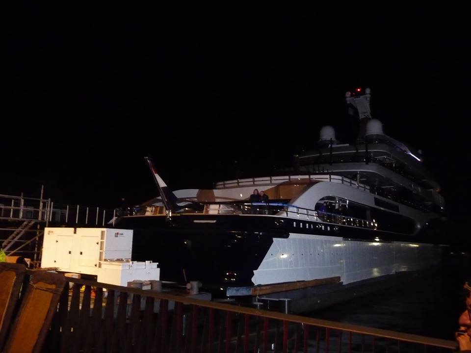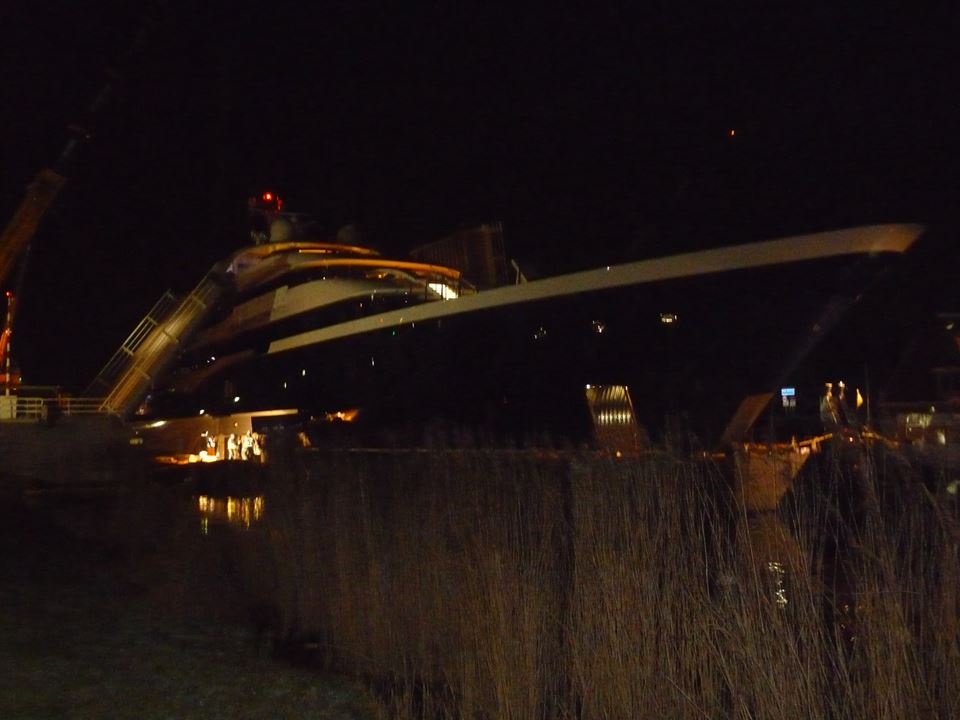 Launched by Royal van Lent at Kaag island in January 2015, the outstanding 101,50m mega yacht Symphony (hull 808) represents the largest Feadship built to date, as well as the largest yacht ever built in Holland. Luxury motor yacht Symphony has been superbly designed by multi-award winning Tim Heywood, with naval architecture by De Voogt and elegant interior styling by Zuretti. Below are the photos showing Symphony, while leaving the Kaag shipyard on the evening of March 12 for her transport to Rotterdam. The photos were released by ‘Feadship Fanclub’.