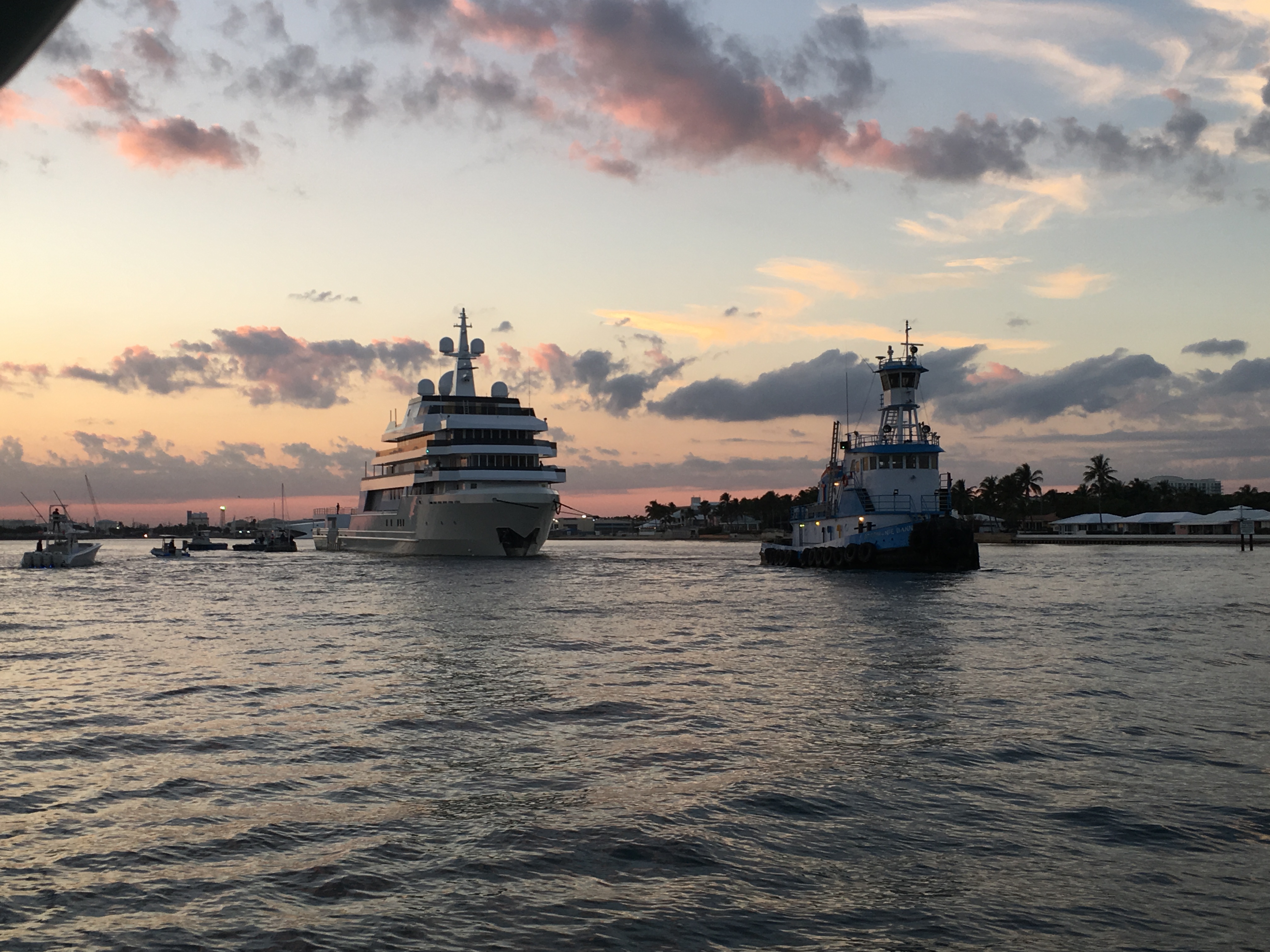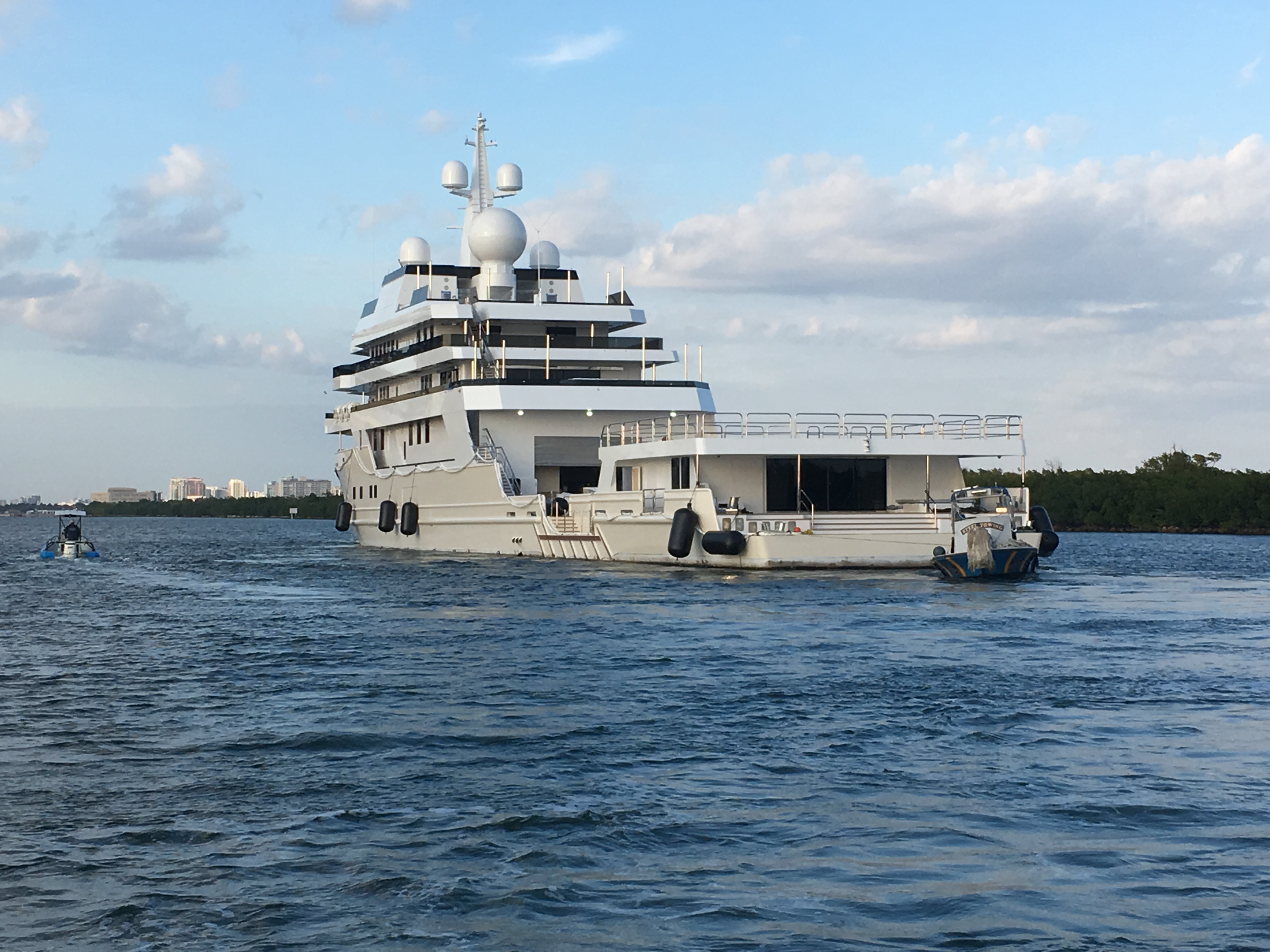 DANAH VOYAGER, the 91-metre expedition yacht project that has been spotted for the first time a few days ago (see article) after works have started on her conversion in 2015. Today’s photos show the yacht being towed from Dania Cut shipyard in Florida to a dry dock, very likely at Tampa Shipyards in Tampa, for completion.