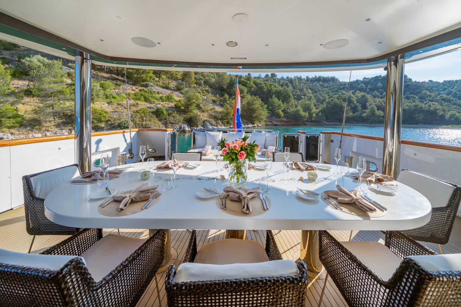 The sunbeds and alfresco dining areas on the flybridge are some of the best places onboard to admire this verdant scenery, however, the foredeck Jacuzzi along with a cocktail at sundown will prove all too tempting to rest weary muscles after a hike or hours spent exploring the cultural treasures in places such as Dubrovnik and Split.