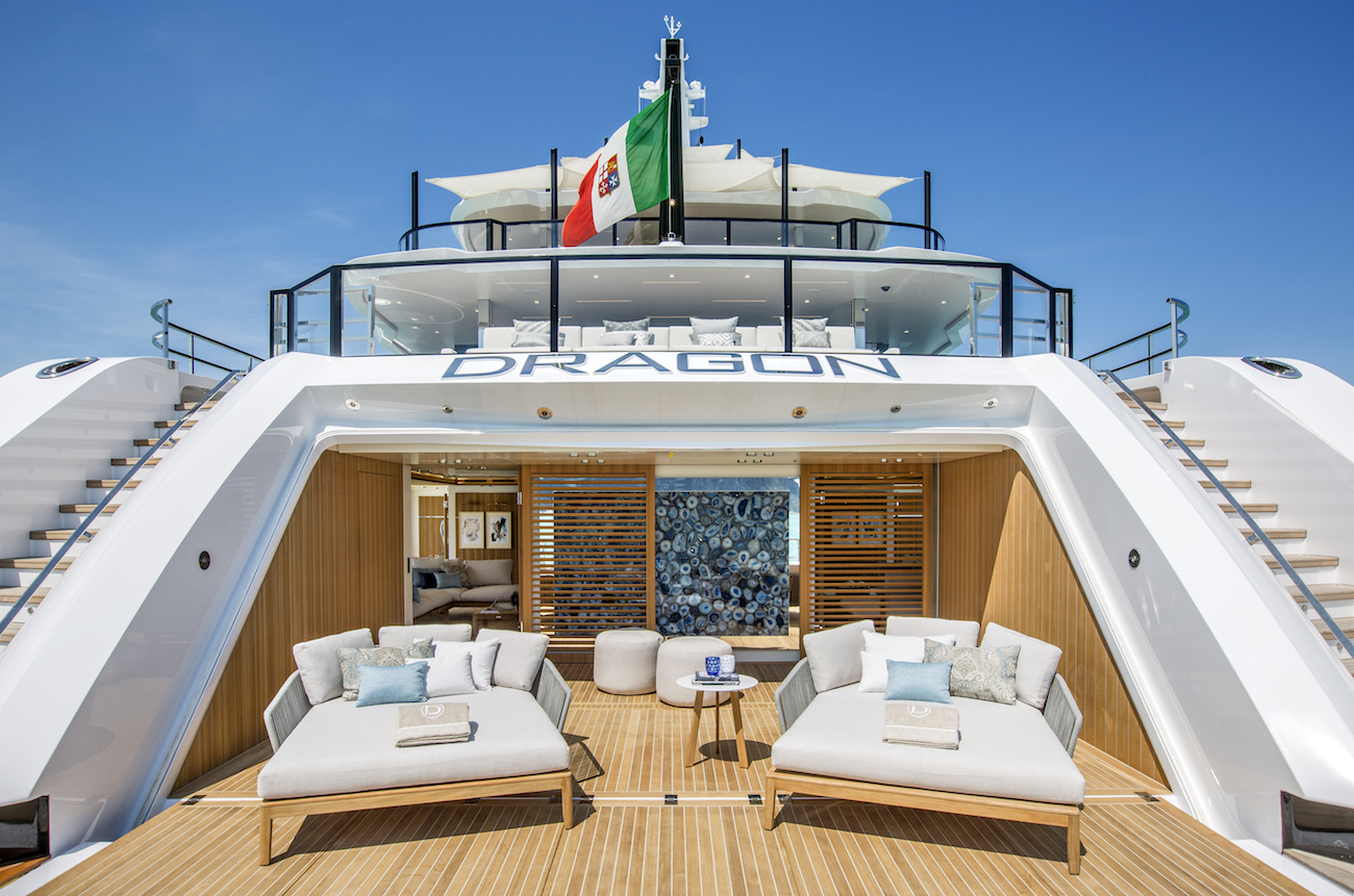 The exterior of superyacht DRAGON makes a dramatic first impression with the deep fold-down swim platform opening up to the beach club while two staircases sweep up to the massive main deck aft. Here, a sunbed covers the aft and plush C-shaped sofas face inwards around coffee tables.