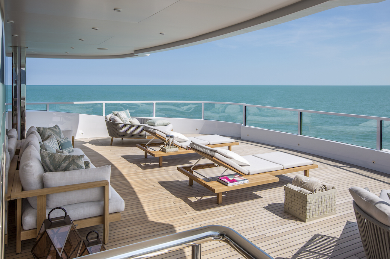 The sundeck is accessible via a lift (elevator) and boasts chaise-loungers along with the bow and a 7m/22.9ft swimming pool to the stern. A blade waterfall separates the whirlpool from the main pool for privacy and serenity while remaining close to the social scene.