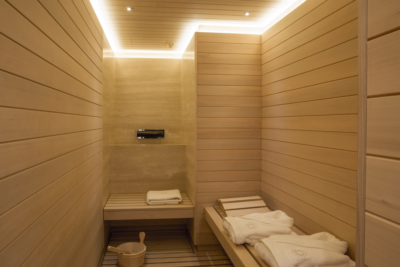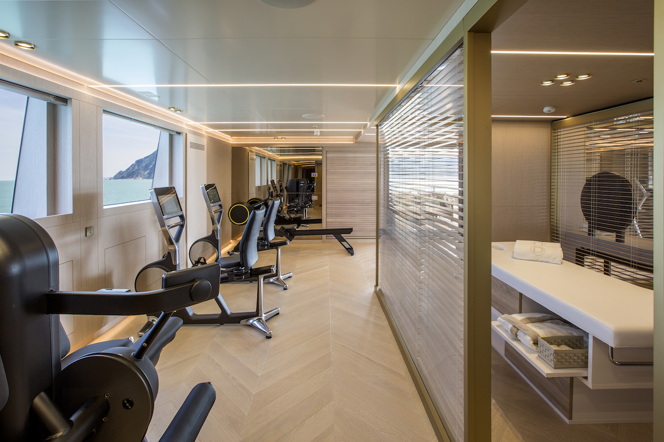 The bridge deck is the perfect place for some pampering, offering a bar, a sauna and a Turkish bath, plus numerous sofas and sunbeds. At night, three back-lit blue agate panels draw in the eye and enhance the environment.