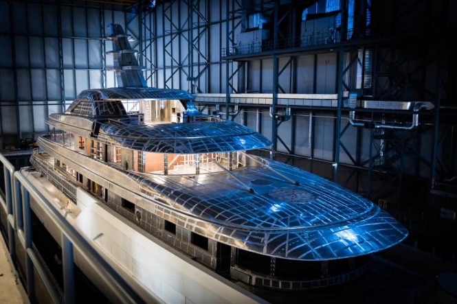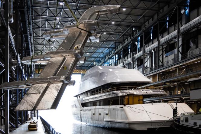 The yacht is currently at the new yard in Amsterdam, which is anticipating the grand opening by Her Majesty Queen Maxima later this week. The size of the facilities allows installation of the mast indoors by using three overhead cranes which have a capacity of 2x 12.5 tonnes each.