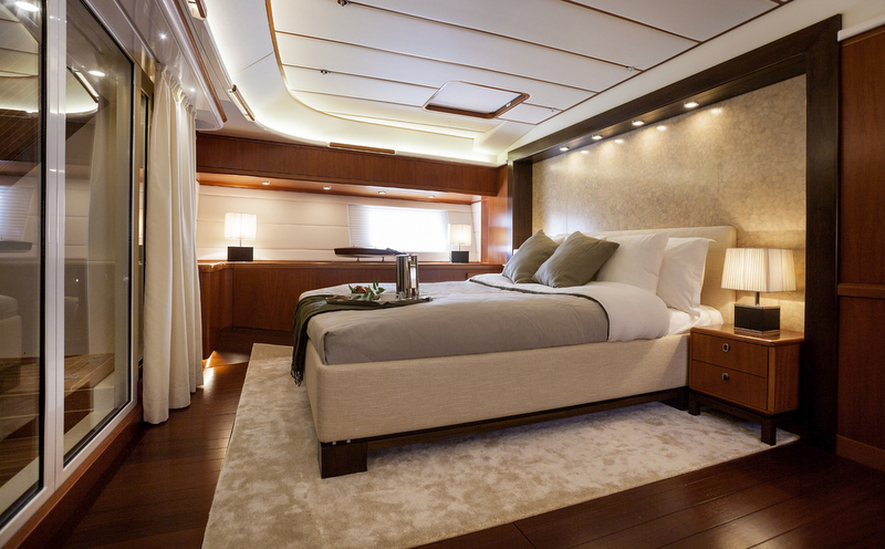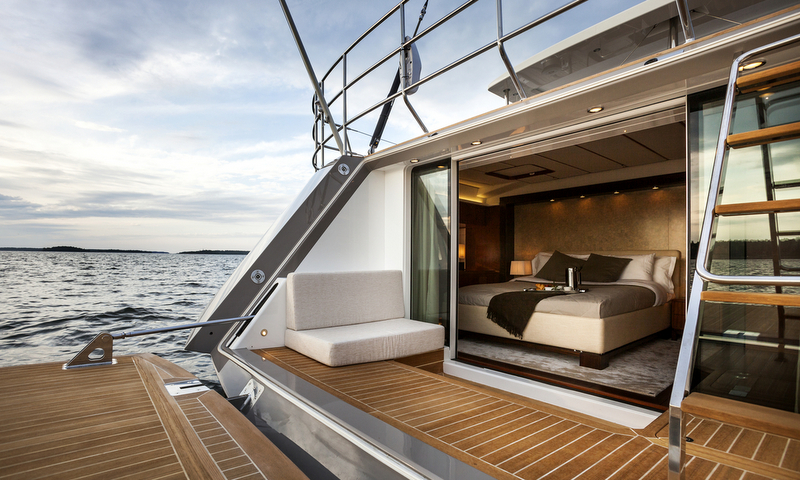 The master cabin opens up onto the platform providing a feel of outdoor living. The broad transom provides ample space for the swim platform with the option for a tender with its own hydraulic launching and recovery system - Photo by Nautors Swan and Eva-Stina Kjellman