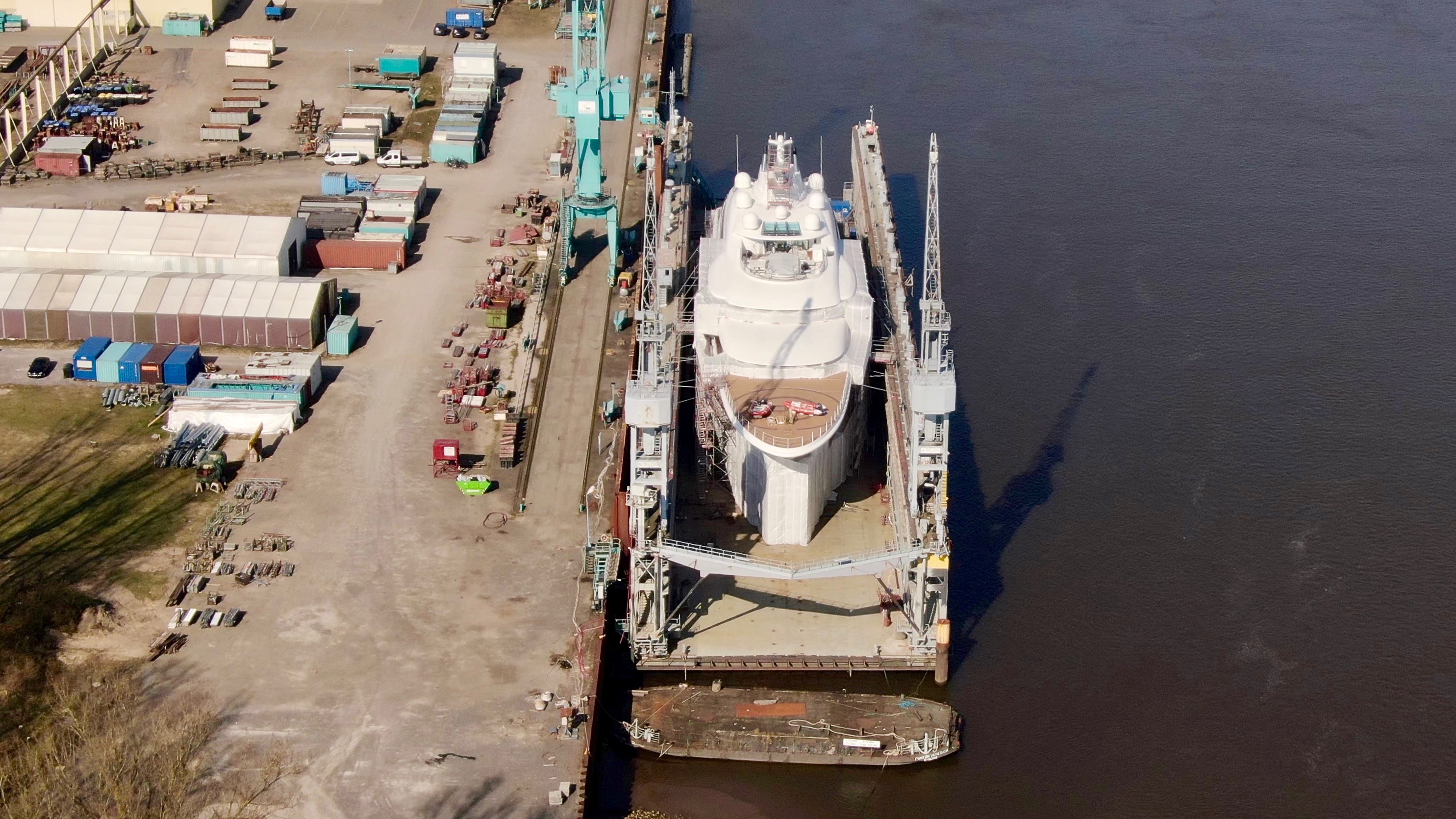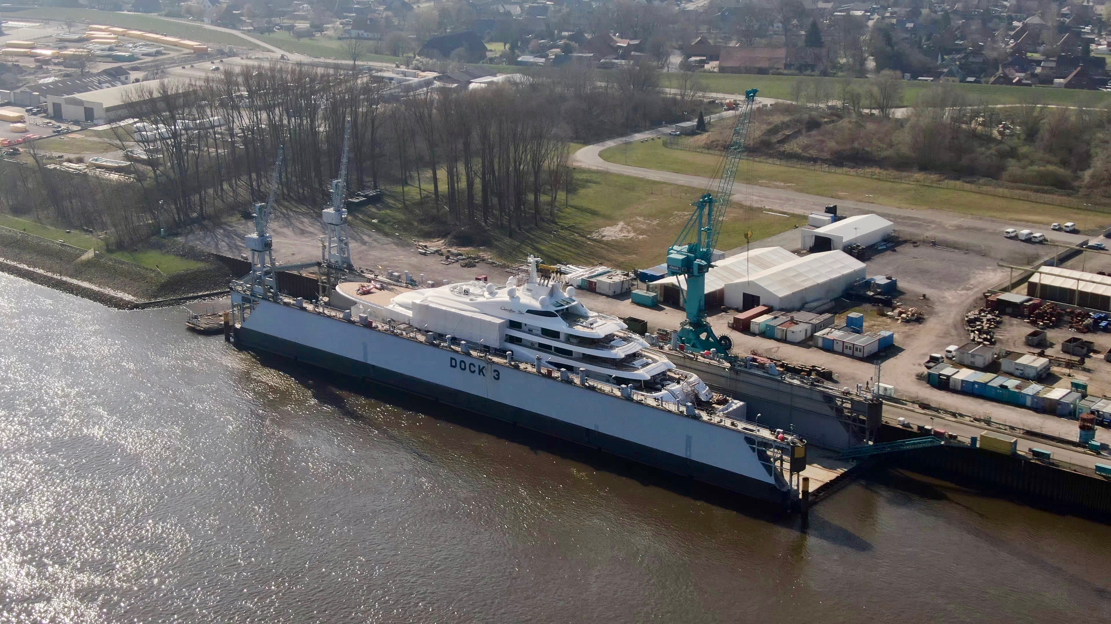 The magnificent 104m mega yacht Quantum Blue has been captured by yachting enthusiast and photographer DrDuu docked at the Lurssen shipyard. She is undergoing a service or a refit at the moment, as demonstrated by the pictures.