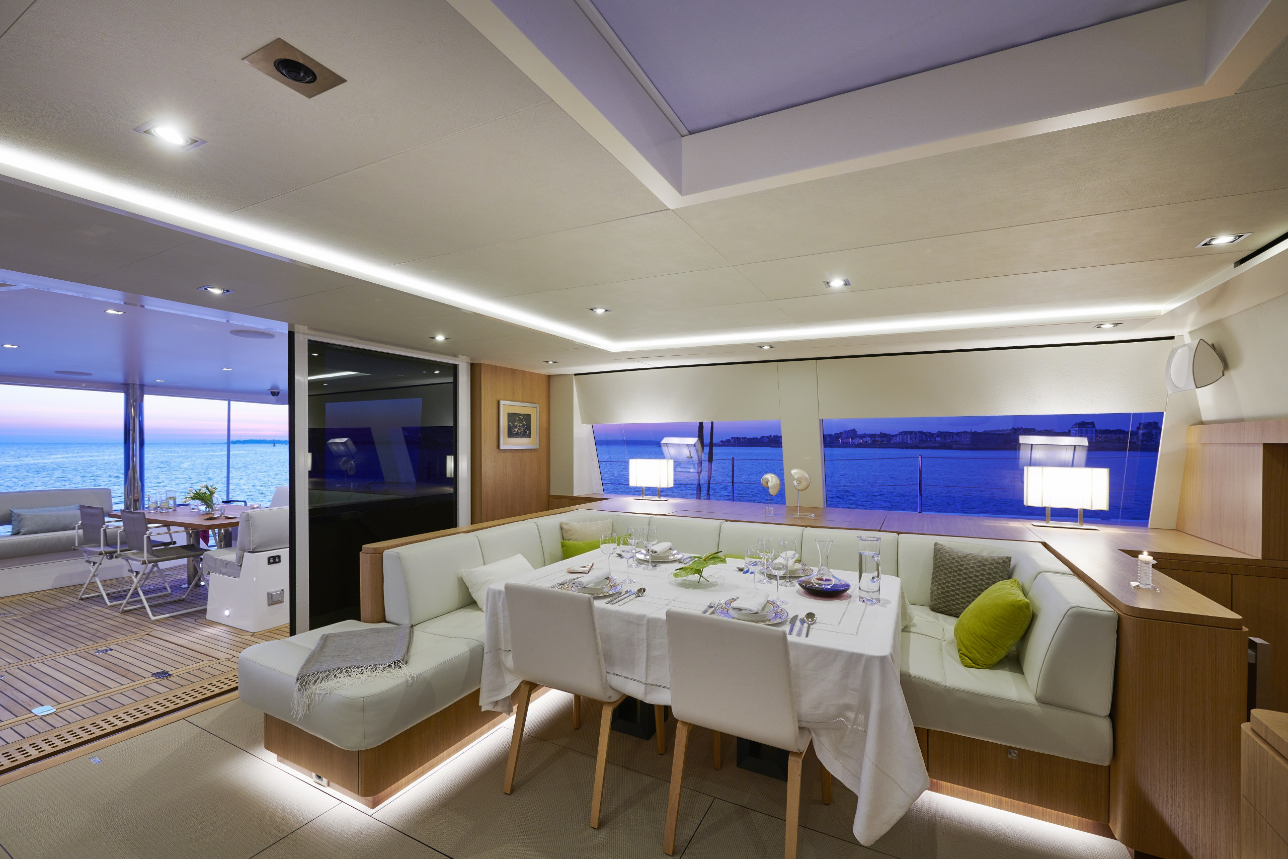 The design provides guests with excellent balance between indoor and outdoor recreational areas that connect with the natural environment: The interior salon places a bar and lounge to starboard and a dining room on the port side with the navigation deck forward and blending the two spaces. Styled by Darnet Design, the shared and private guest areas are styled in oak and contrasting walnut.