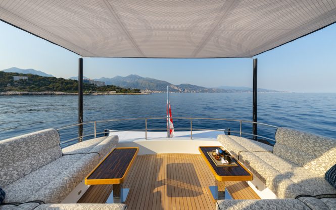 The flybridge has been converted from storage for the tender into a place where guests can unwind in the sunshine or pull over the bimini shade to savour drinks or a light meal from the C-shaped sofa while enjoying the warmth and the views.