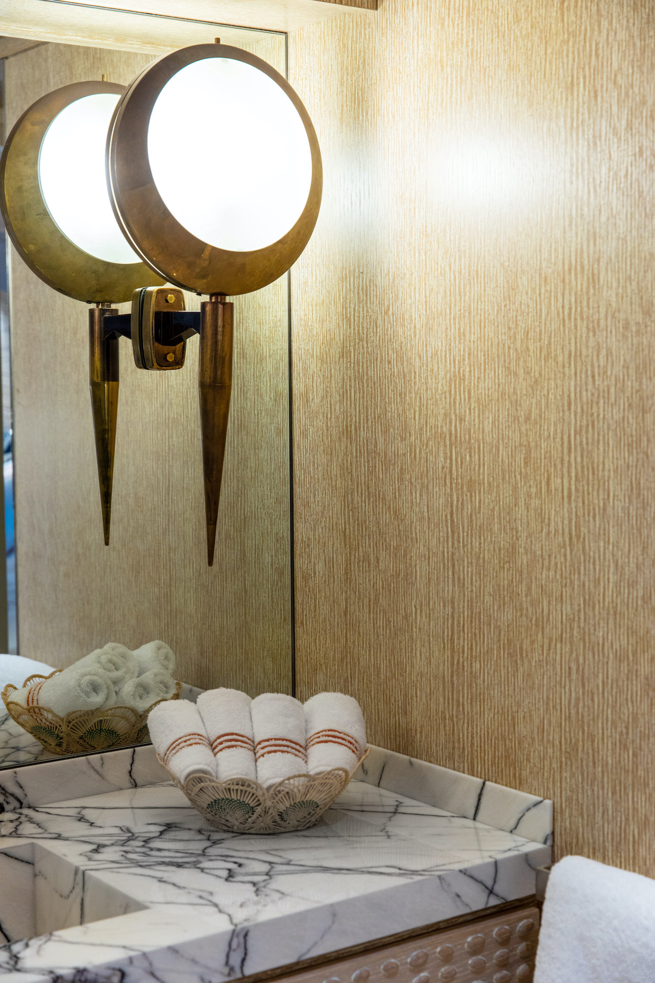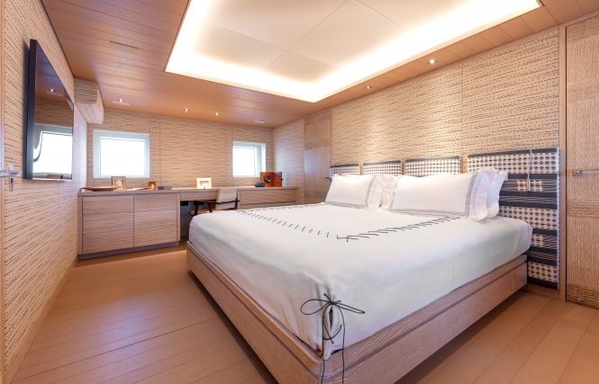 The forward guest cabins have also undergone extensive changes: Whereas before there were side-by-side bunk cabins, there is now a full-beam Master suite with dressing room and marble bathroom. Even the en-suite VIP stateroom in the bow has received modifications to move the port-side wardrobes to the aft wall to introduce more natural light into the bedroom.