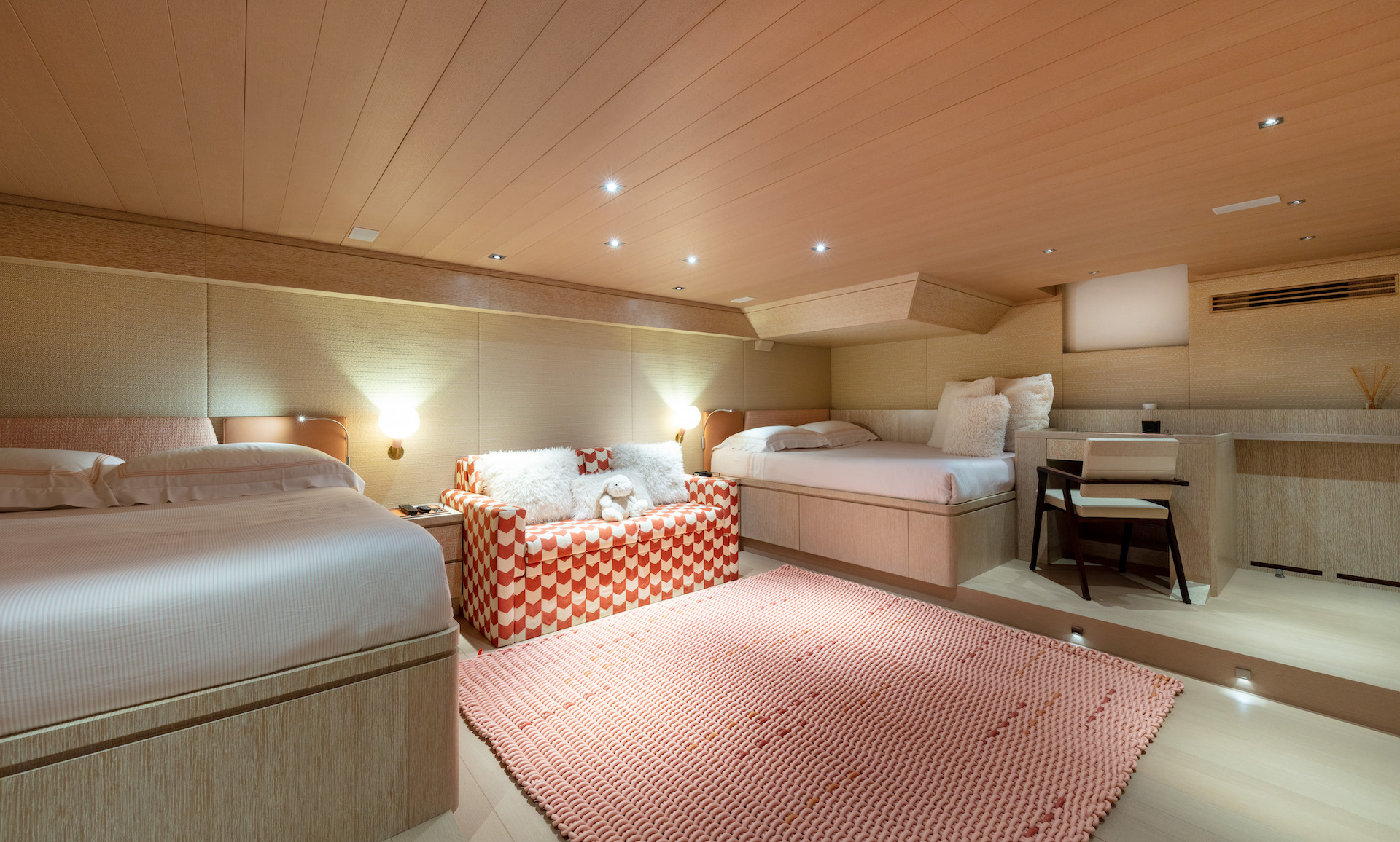 Outside, the main deck aft cockpit has been installed with a broad row of sunbeds and a fixed alfresco dining area providing diners with a raised table, plush sofa seating and movable chairs. The foredeck now has the inclusion of windows to light the guest accommodation below, and the superstructure conceals storage for motorised water toys and a tender, which are safely launched and retrieved using a Davit crane.