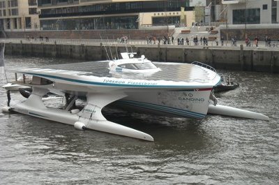 Plantesolar, the largest solar-powered catamaran in the world was launched on the 31st of March and navigated for the first time at the beginning of May off Kiel. The solar powered catamaran PLANETSOLAR’s test phase should last until the end of the summer and will then prepare to set sail on its maiden voyage to circumnavigate the globe in April 2011.