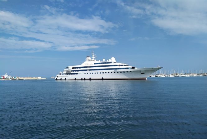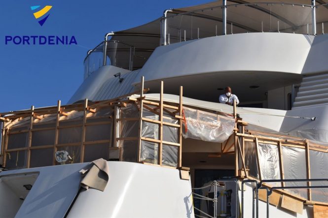 The 105m/344ft motor yacht was recently listed for sale and in preparation for her new Owner she is receiving an extensive refit of all her teak decks in addition to an overhaul of her main engines and generators, with engine room welding work currently underway.
