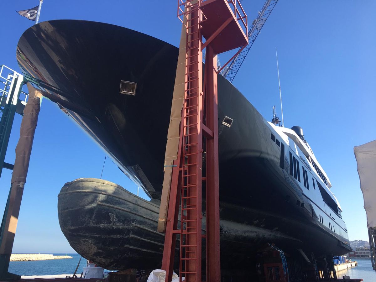 30m/98ft M/Y BANDAZUL was built by Princess Yachts in 2018 and is now undergoing maintenance ahead of the Mediterranean party season. She has been lifted into dry dock using the on-site travel lift at Port Denia, where she will be checked for general wear and tear from her first year of use.