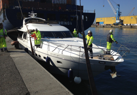 Princess 23M Yacht ISABEL being loaded on to a ship in Genoa, Italy