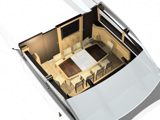 There are many innovative solutions adopted for the furnishings too. These include a multipurpose unit in the saloon that can be used as a TV unit, an elegant sideboard and a bar. It can also be rotated and used either from the saloon or the exterior dinette.