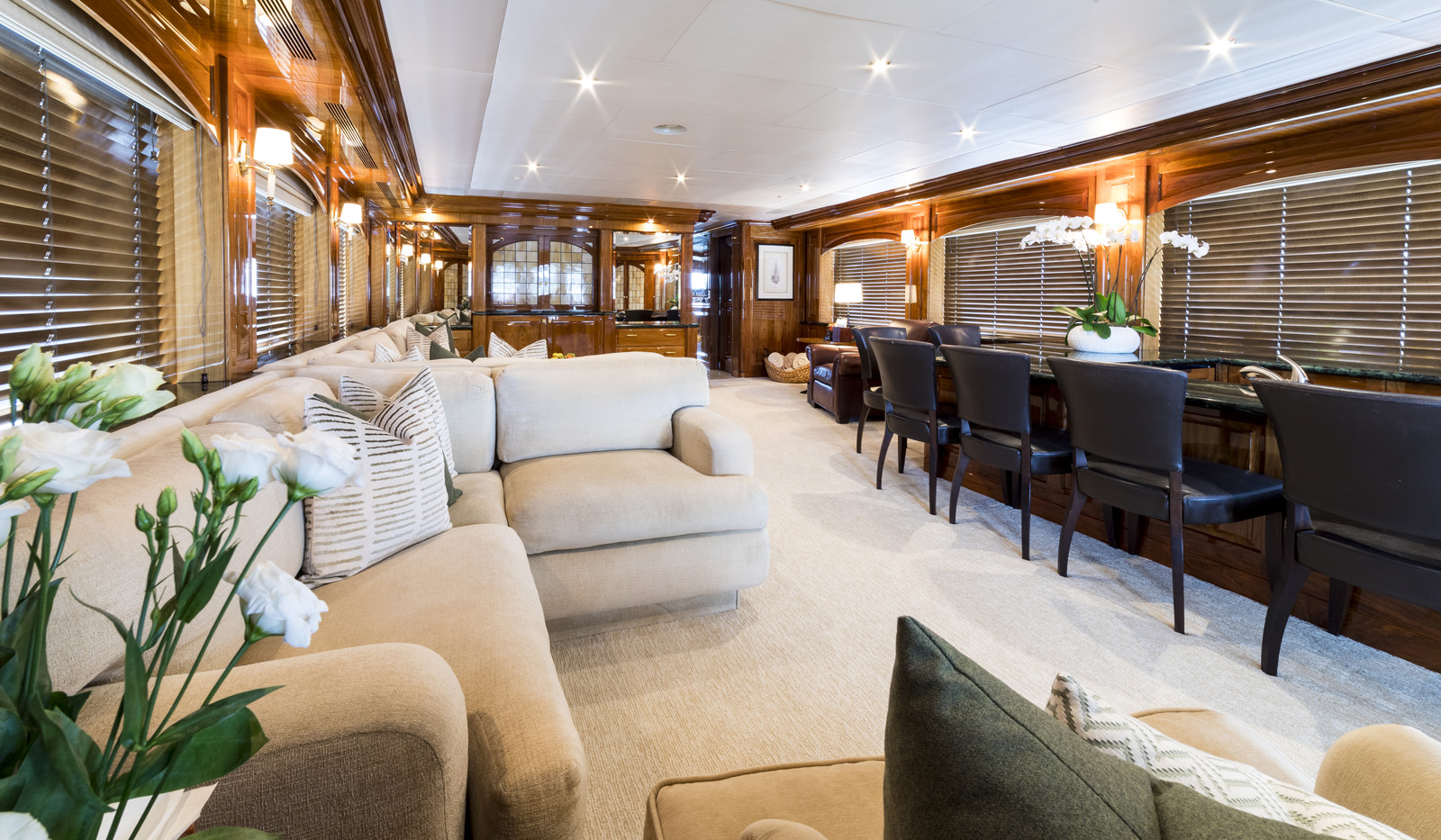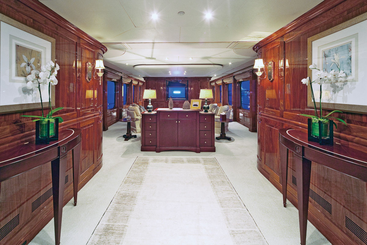 The yacht’s interior finishes are elegant, featuring beautiful woods and neutral fabrics throughout. A generous salon on the main deck offers a sumptuous lounge, followed by a formal dining room amidships.