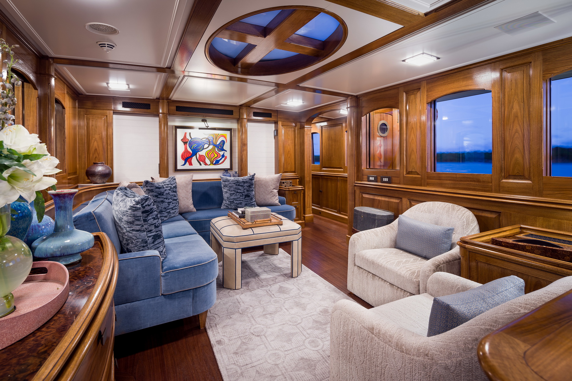 The interior was stripped to metal, insulated, and rebuilt with a simplified 1930s style, replacing the elaborate Art Deco features installed by previous owner Tom Perkins. The new interior, designed by deVosdeVries design, features French walnut joinery and an artful antiqued finish created by Acanthus International. The interior spaces are now more casual and focus on guest comfort and family living rather than entertaining. One of the biggest changes is that the former indoor dining saloon overlooking the foredeck is now a comfortable media room with a welcoming overstuffed sofa and chairs upholstered in a linen textured off-white shade.