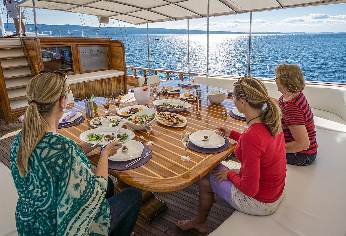 The beautiful wooden panelling in each room is matched by the furnishings, and crisp white upholstery, carpets and ceilings between the beams enhance the light on board. A wet bar to the aft has a wide selection of spirits, soft drinks and coffee to suite all ages and occasions. A widescreen TV is placed forward for entertainment in the evenings and during transit, and there is Wi-Fi on board for guests to use whether in port or among far-flung isles in the Istrian Peninsula.