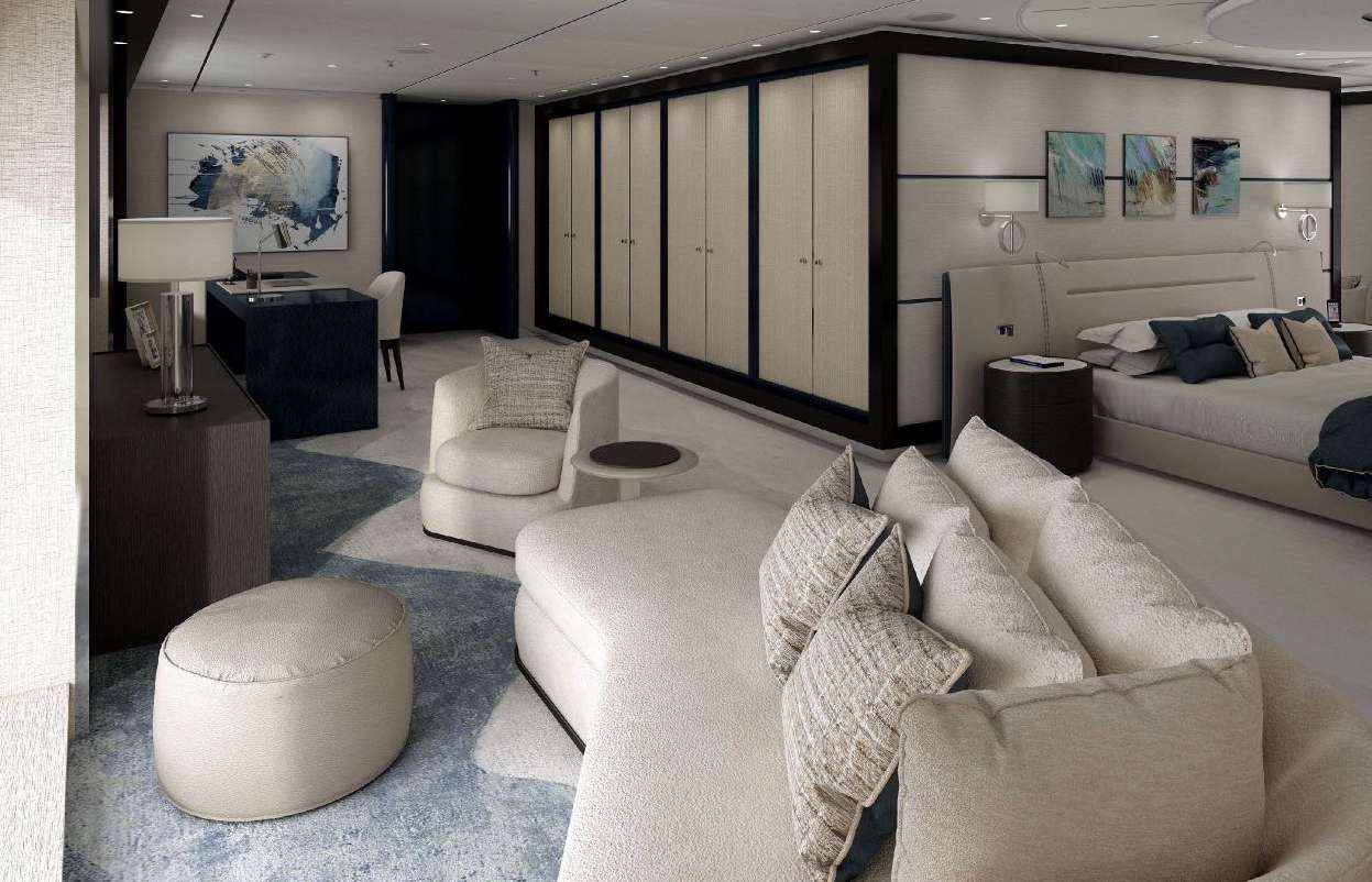 Meanwhile inside, the classic contemporary design is characterised by amber and dark wood tones in the main and upper salons where there are dining and lounge zones including a unique circular glass dining room on the upper deck.