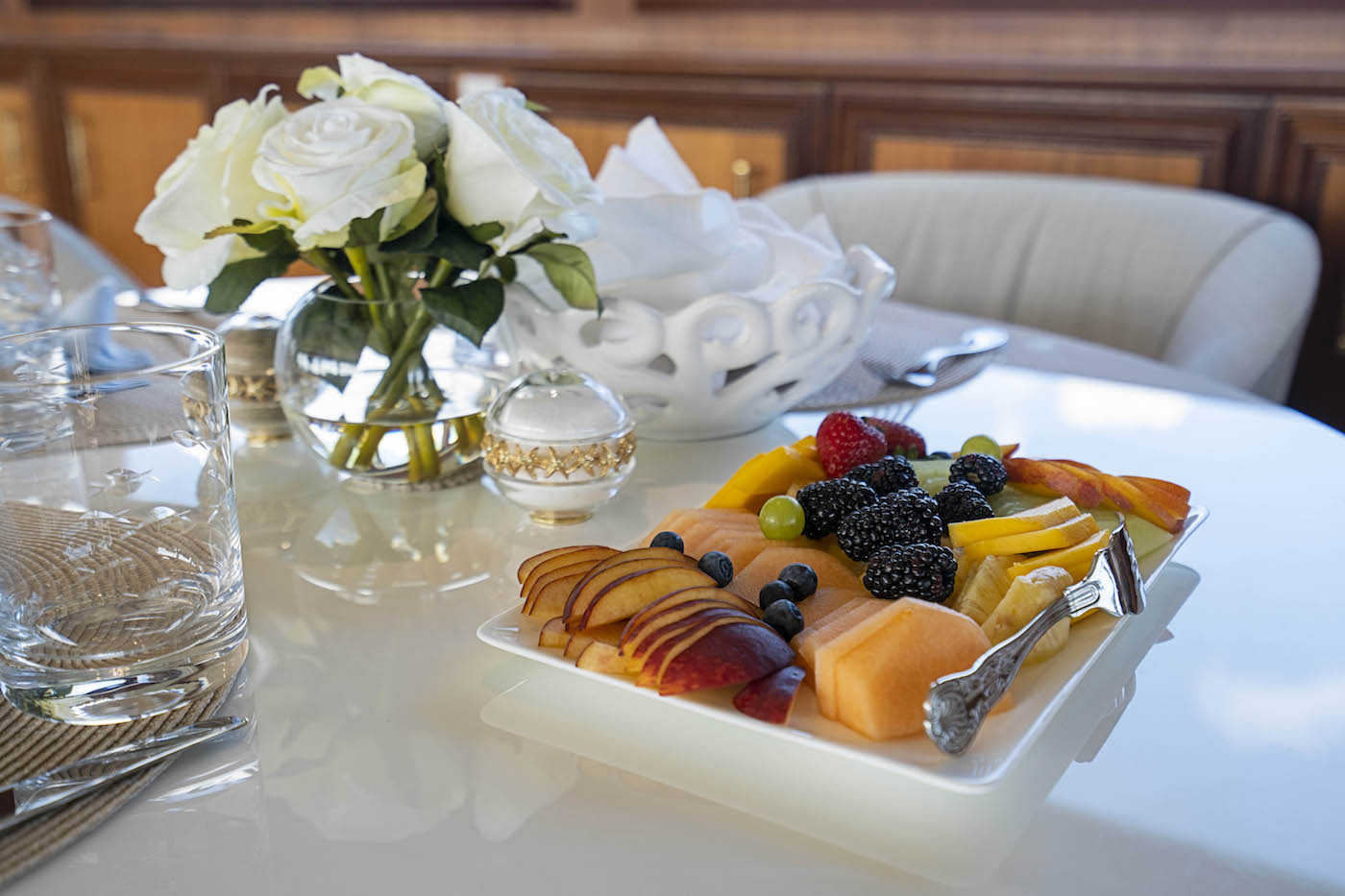The formal dining room amidships features a circular dining table for intimate family meals while also creating the perfect ambience for celebrating a special occasion.