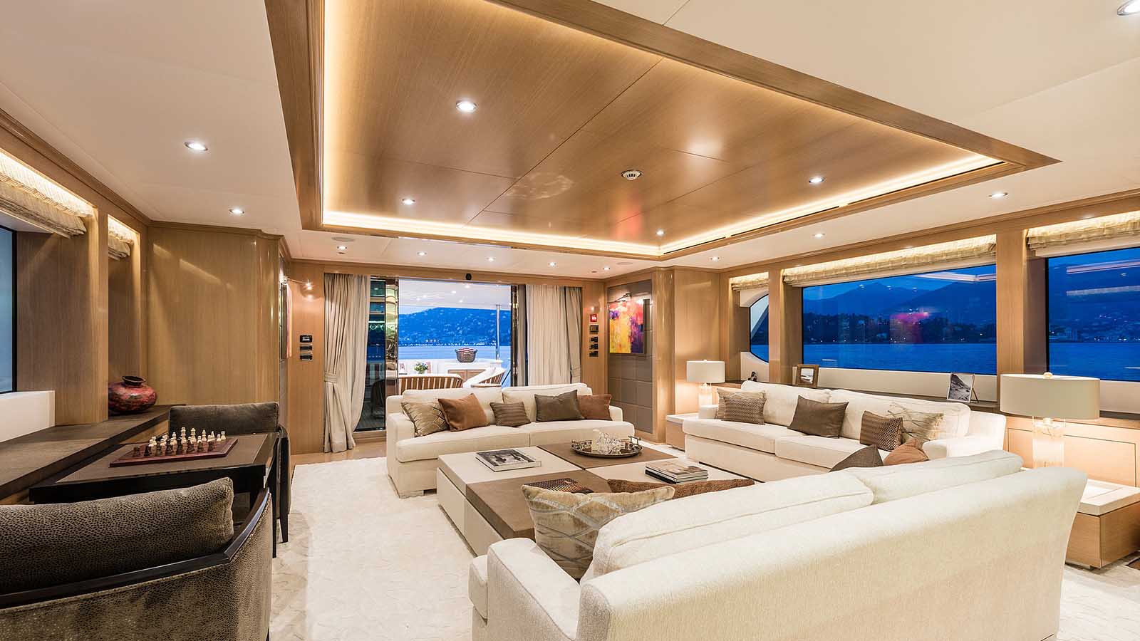 Inside, the sophisticated contemporary surroundings are ideal for a special occasion or for a family get-together between the different generations. Dine together seated in plush armchairs in an intimate surrounding, then watch a film before bedtime in the sumptuous salon, which feels like a home away from home. Both the main salon and sky lounge above have TV entertainment and a bar, creating options for hosting your own dockside party on a sensational summer night.