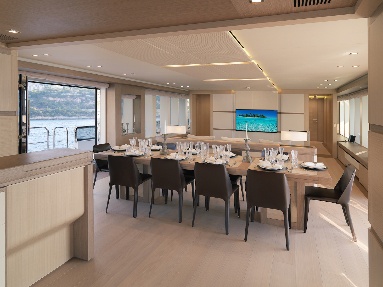 The light-suffused interiors have a pale earth-toned colour scheme that makes a warm and welcoming environment for charter guests of all ages. The main salon will likely be the first and last place where the whole group gathers together, planning the day over breakfast at the table before resting weary bodies on the sumptuous sofa, watching a film at the end of the day.
