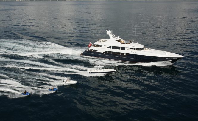 At 47 metres/157ft, motor yacht Cocktails is a beautiful luxury vessel available for charter in the Caribbean and the Mediterranean. She was built by reputable Trinity Yachts and fully refitted in 2012. This yacht is ideal for holidays with family and friends and offers a great variety of water toys, as well as tenders and fishing equipment. Her timeless interior was created by Howard Designs. Soft furnishing, vast seating and lounge spaces provide extra comfort onboard Cocktails. Charter guests will find lots to do, as the yacht has great entertainment amenities and a large Spa Pool on the Skydeck.