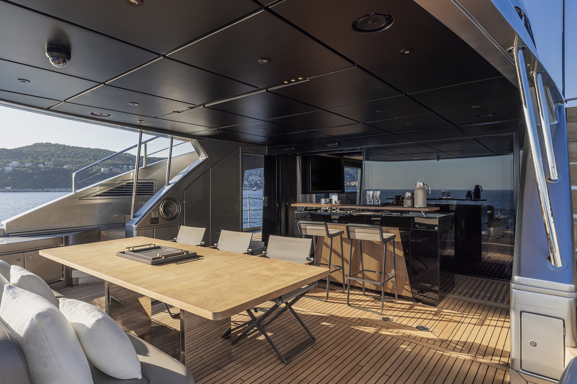 The internal volumes are uniquely generous including a main salon furnished with armchairs, an L-shaped sofa aft and a forward dining area with seating for up to 10 guests. The galley is forward and can be kept open to the salon to create a show kitchen with bar counter.