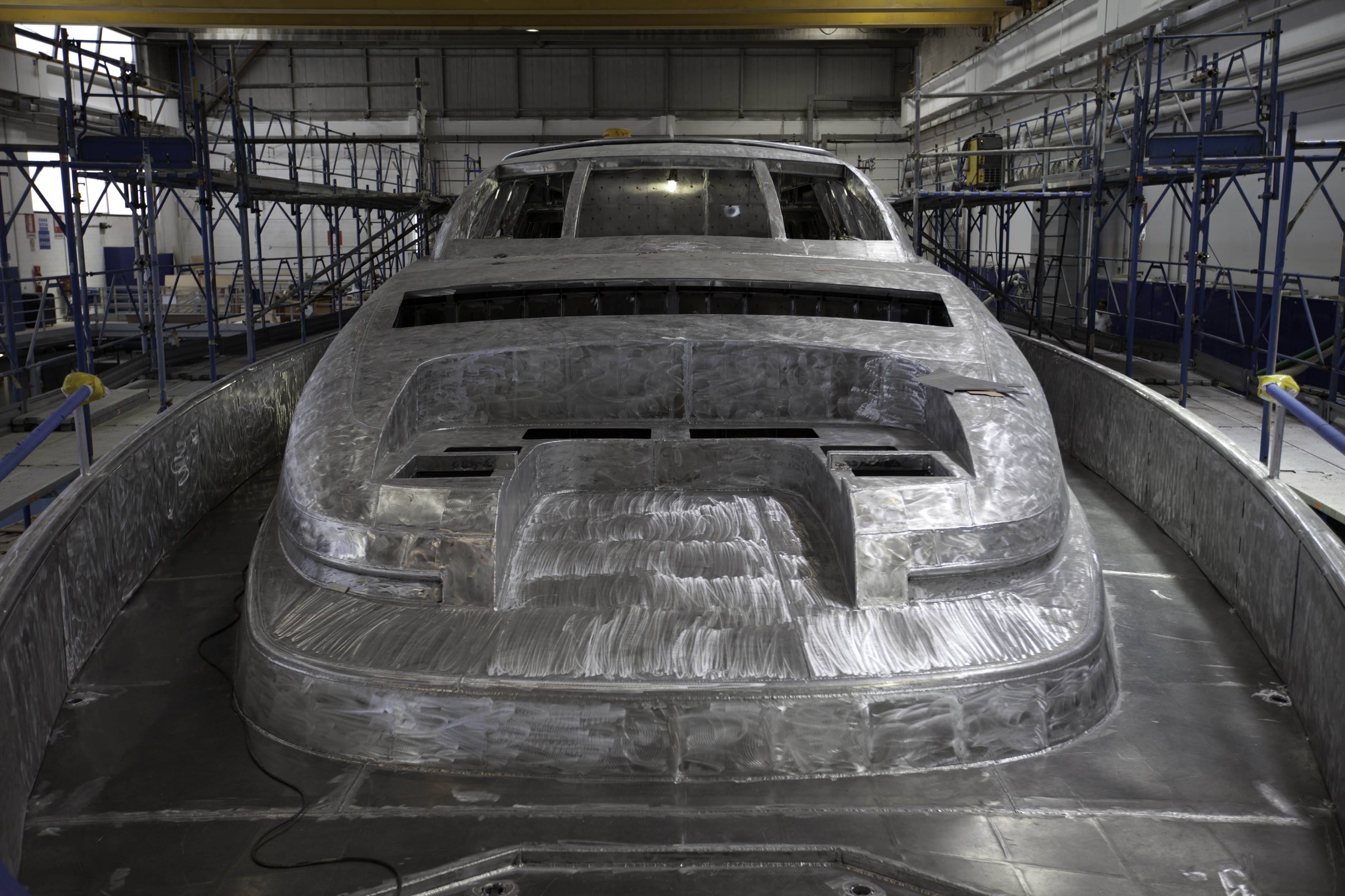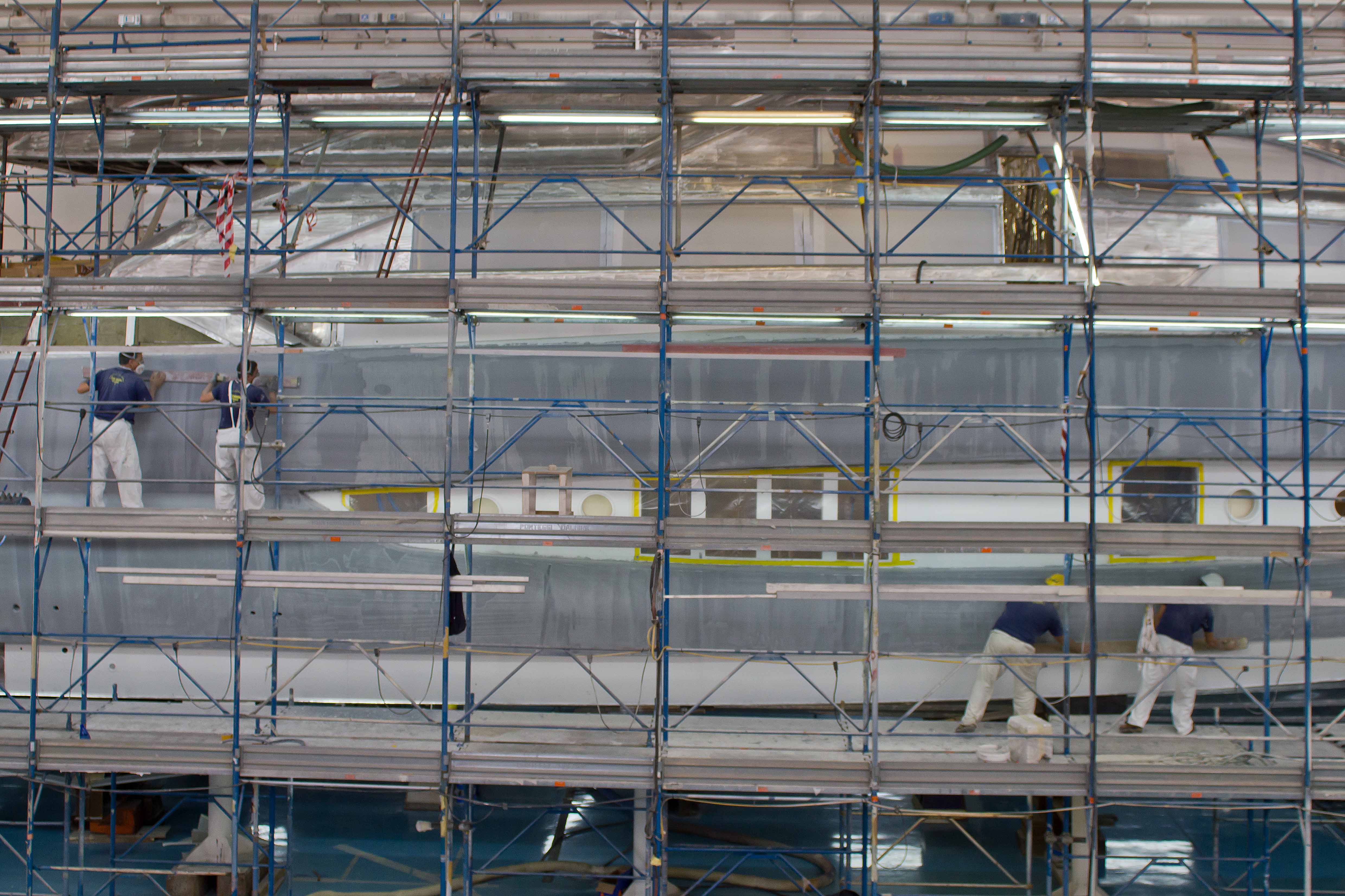 The new Riva flagship is currently on schedule for its delivery date. The hull and the superstructure were completed over the last few months, and carpentry works are currently being finalised. As for the exteriors, the disc grinding and primer application, the primer is a protective material separating the sheet metal from the putty layer, have already been completed and the puttying process is currently ongoing. The top coat application – which is always the last stage in the process – will be completed by the end of February, when the hull takes on its final appearance. To highlight the hull lines Officina Italiana Design (OID) proposed two different shades of grey. A lighter one (“Regal Silver”, a brand-new shade, specifically conceived for this model) and a darker one (“Charcoal”, one of the most largely appreciated colours within the shipyard’s available colour range).