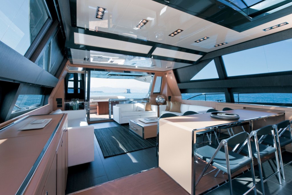 The closed, air-conditioned upper salon of the new Riva 86′ Domino motoryacht offers an open space area with the dinette and incorporates much natural light both through the large side windows and the windshield. The design of the furnishings and the special shades of elm and grey durmast with natural-coloured leather inserts and grey lacquering make this an attractive, welcoming environment, emphasising the spaciousness.