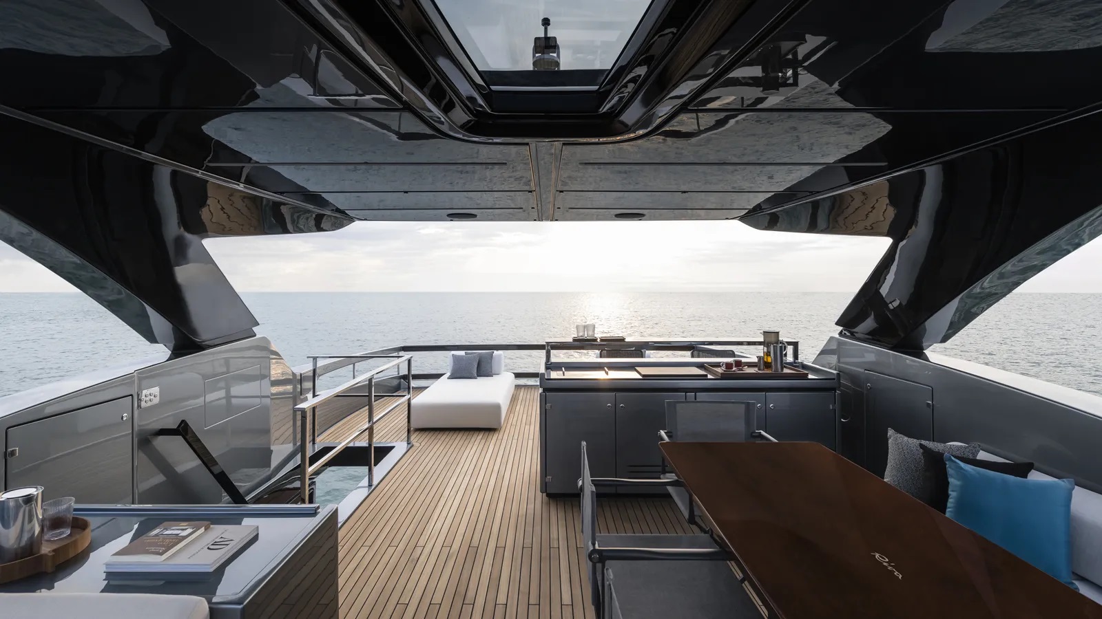 She shares some features with her predecessors such as the low and sporty profile and distinctive windshield – but presents innovative new solutions including higher gunwales with painted composite profiles instead of traditional handrails. The designers committed to exploring innovative ideas across the exterior deck spaces and have created a generous flybridge with a carbon fibre hardtop and glass panels and a versatile beach club which can be expanded by opening two large bulwarks. The 35sqm cockpit is filled with outward looking sofas making the most of the sea views under the shelter of the flybridge overhang.
