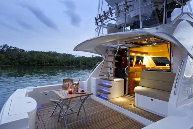 The oversized cockpit features an optional electric barbecue centre with sink, storage and rubbish bin shoot, giving boat owners a gourmet kitchen on your transom. The large cockpit also includes a mezzanine seat and wet bar located below the floating stairs that lead up to the open flybridge.