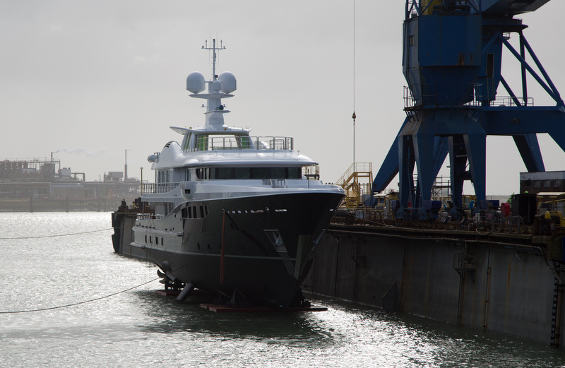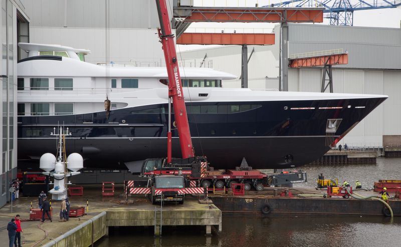 The brand new 55-metre AMELS 180 motor yacht Hull 467 unveiled her beautiful dark blue paintwork to the world, following her very efficient final completion and commissioning. In a meticulous ‘RoFlo’ launch at the AMELS yard in Vlissingen, the 700 tonne Tim Heywood-designed superyacht Hull 467 was first moved from one of the AMELS fully climate-controlled covered dry-docks onto a floating pontoon, then to a floating drydock, which submerged and the yacht floats.
