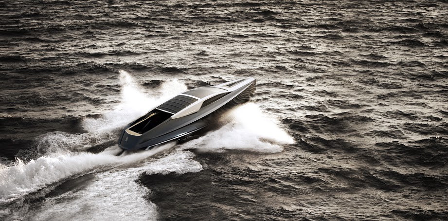 The subtle exterior form compliments the Rolls-Royce brand’s traditional styling while also paying tribute to its mechanical excellence and reliability, with exposed surface drives denoting the potential power and nature of the vessel. An extended tunnel hull coupled with a suspended interior deck help re-create the famous ride comfort of the brand and allow for the effortless acceleration associated with the vehicle. A floating waterline when at rest helps enforce the ethereal nature of the brand and benefits lifting forces to help achieve planing speeds. The forward ‘prongs’ help maintain a visual connection with the water surface when planing and increase airflow into the tunnel hull.