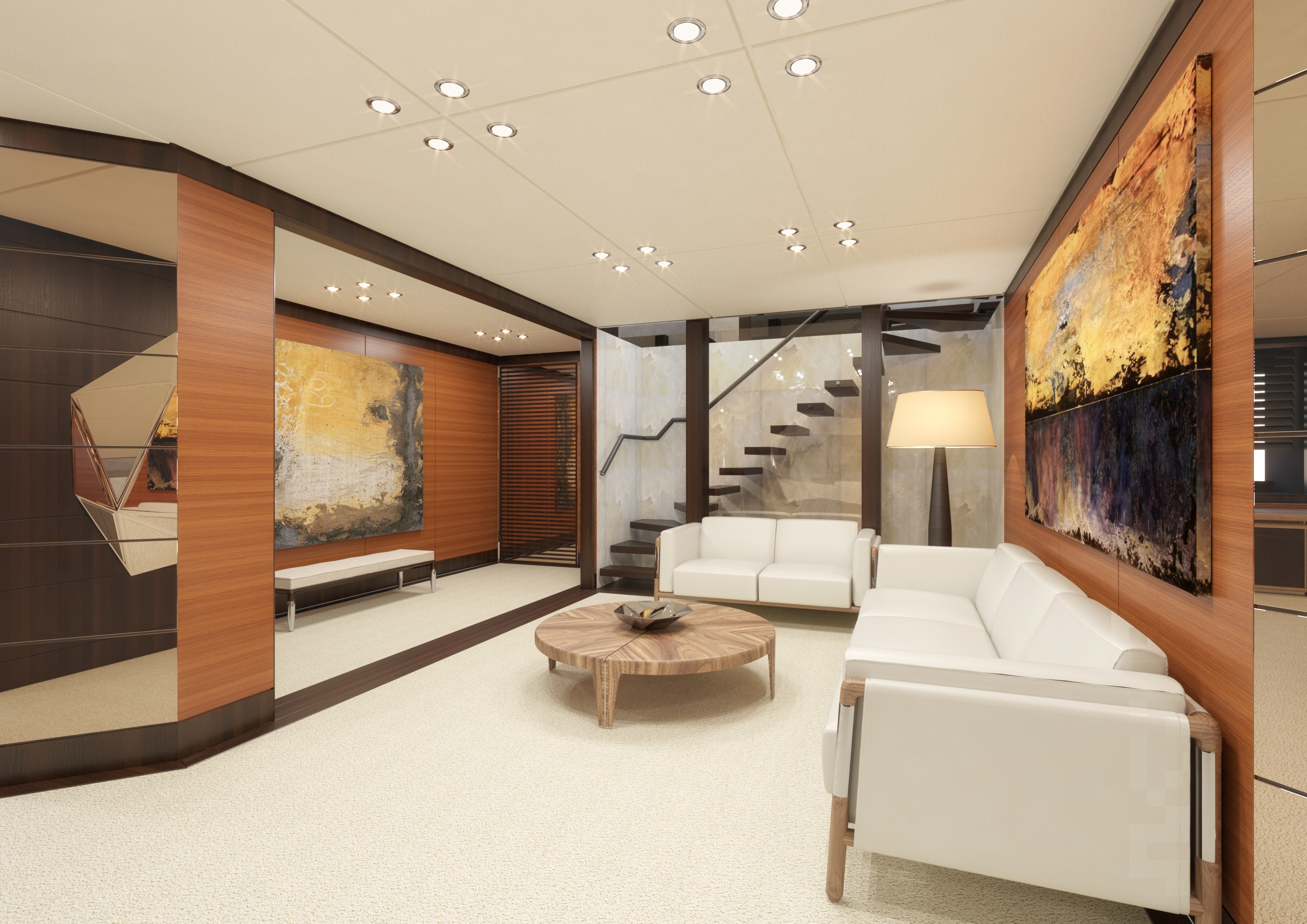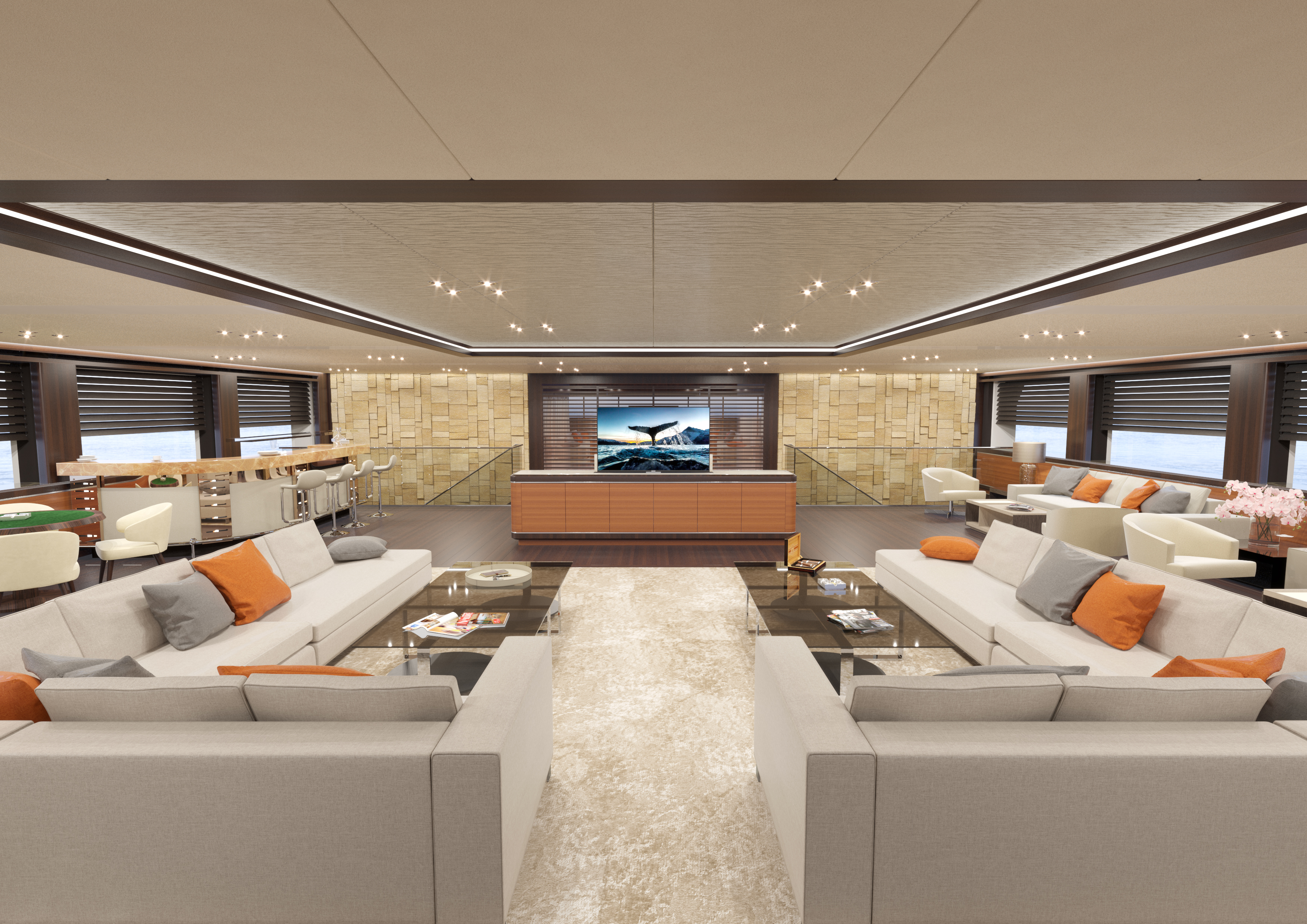 The owner’s deck features a full-beam forward suite using an open plan layout containing His & Hers bathrooms, a walk-in-wardrobe and a private aft dining room. The upper deck is also designed for the owner’s personal use and the layout contains a private lounge with a study and access to the open foredeck with pool. There is another salon to the aft for all guests to use as a media room or a skylounge.