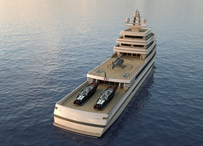 Two versions of the concept are available that place the helipad either amidships or aft as the client prefers. Although both designs are estimated at 2,200GT and have deck storage for large tenders, the aft helipad configuration has the practical advantage of allowing a sailing yacht to be stored amidships without impacting on helicopter operations. Furthermore, the generous salon beneath the helipad can instead be used as a dedicated hangar.