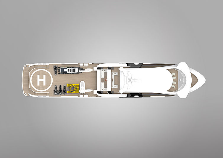 Four decks host lavish living areas, including a large swimming pool, sunbathing and outdoor dining areas. The helipad on the main deck is designed to carry a helicopter, however, it can also be transformed into a spacious sunning area with sunloungers.