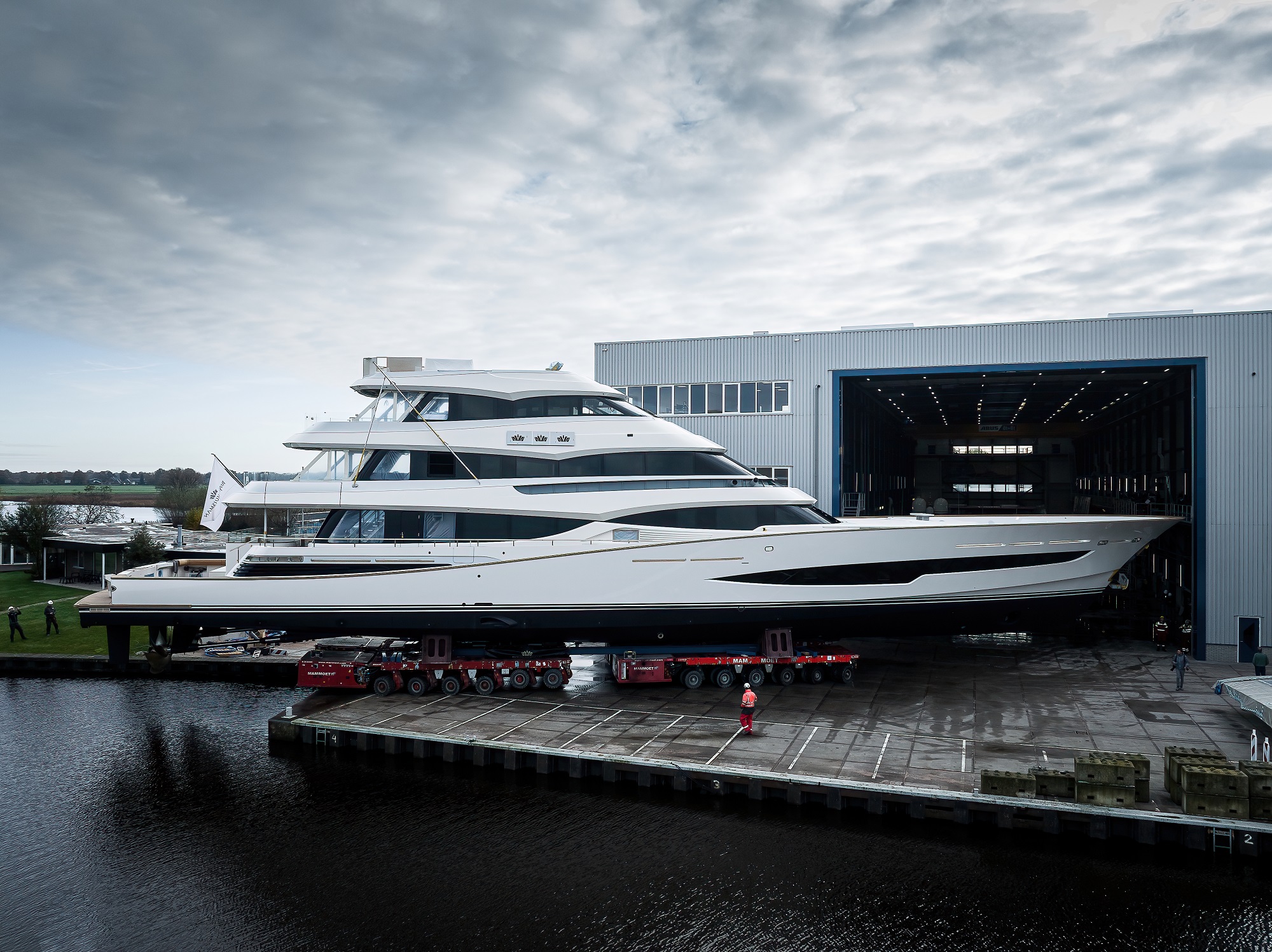 The team at Royal Huisman have announced that 52m (171’) motor yacht PROJECT 406 has left the construction hall at their facility in Vollenhove in the Netherlands. The next stage of construction will involve the installation of her upper deck, sun awning hardtop and radarmast.