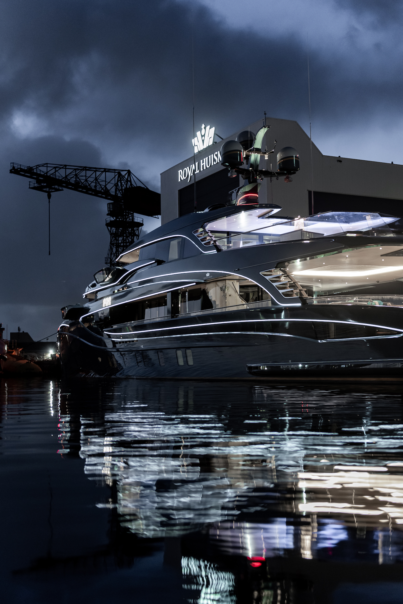 The delivery of 55m/180ft Royal Huisman luxury yacht PHI was celebrated in style with a laser light show using the onboard exterior lighting.