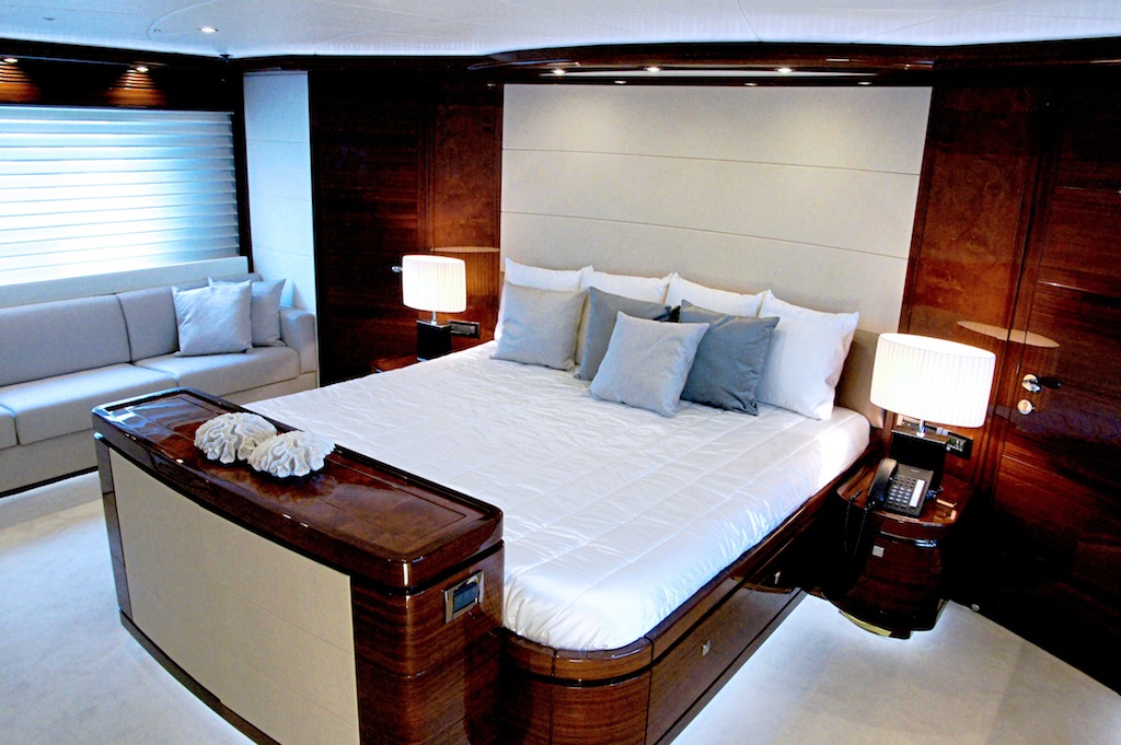 Her master bath is designed with brown onyx and includes a large bathtub, shower room, as well as his and hers sinks. There is also one full-beam VIP cabin and two twin-bed guest cabins. A stairway in the salon leads down to the crew area.