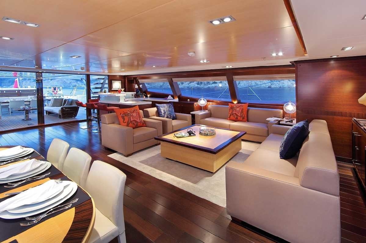 The interior is extremely spacious for a sailing yacht and is finished in a gorgeous blend of traditional wood crafted in a contemporary style creating a backdrop for elegant furniture and neutral fabrics. The main salon hosts a dining area, lounge space and sit up bar.