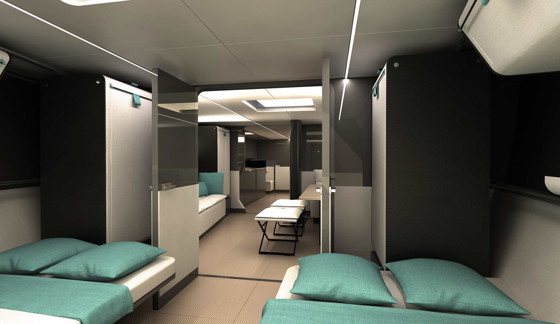 The functional interior hosts the salon forward and crew cabin and galley amidships. The owners have enhanced privacy, thanks to the separate area located forward of the salon, while guest cabins are situated aft.