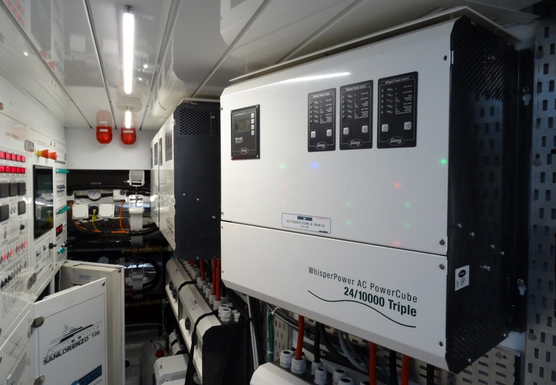 A second objective was to make luxury yacht Sanlorenzo 106 Hybrid “quiet” overnight whilst still providing maximum comfort. As the onboard power supply was set up as three-phase 400 volt, WhisperPower developed a 10 kW three-phase inverter that enabled the air conditioning units, refrigerators, freezers etc to continue to run. In total, 40 kW can be loaded on to the inverter. As a backup, two 15 kW Genverters have been installed together with several DC PowerCube charge modules that quickly and completely charge the batteries either when shore power is available or via the Genverters. All components, including the non-WhisperPower products, are connected via a central CAN bus system.