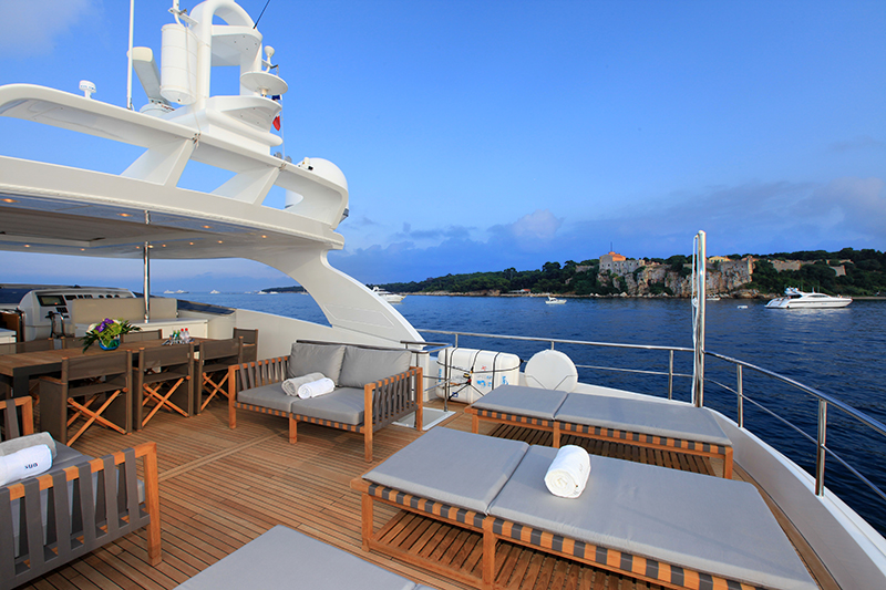 Charter yacht SUD has a well-appointed exterior living, boasting 3 alfresco dining options. The aft deck is shaded and adjacent to the salon, with seating and dining. On the bow, there is a further alfresco table, ideal for breakfast and lunch. An upper deck has dining, seating and sun pads.