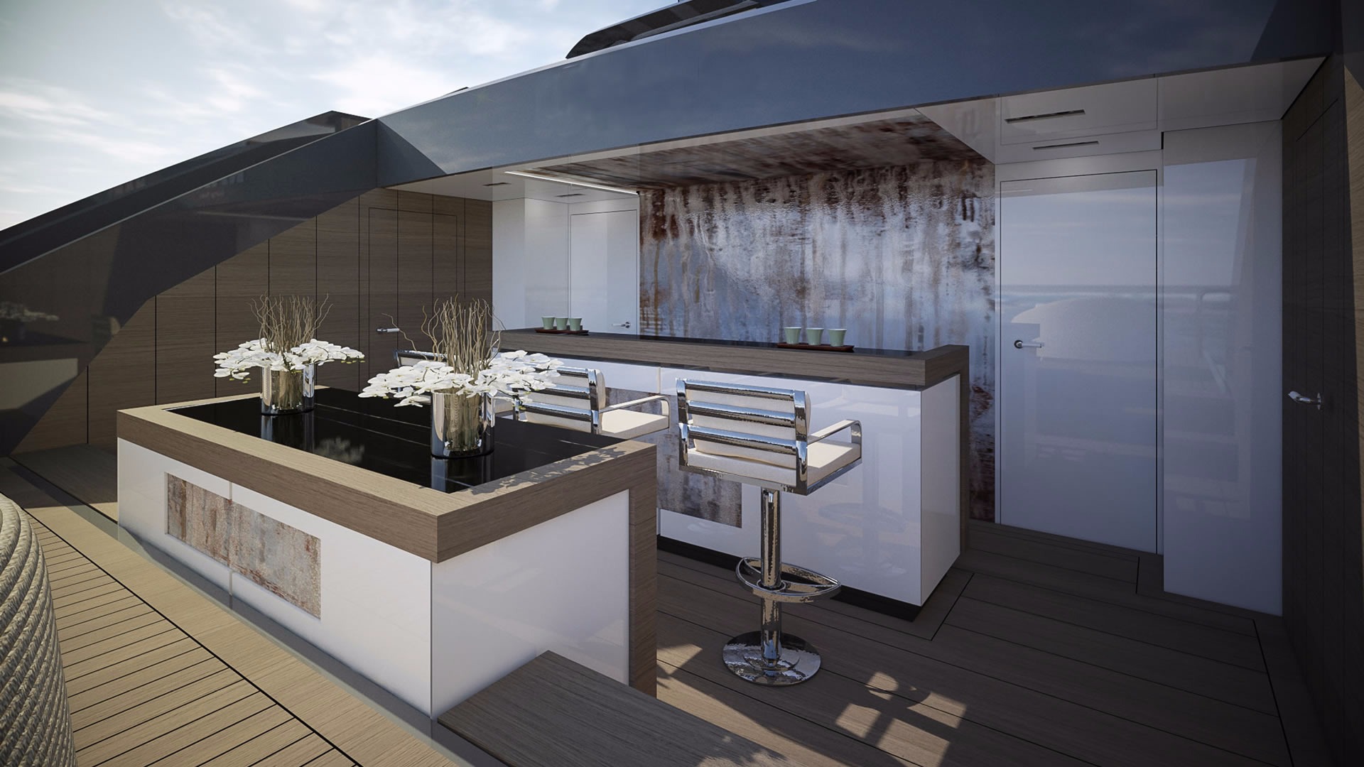Auoda can accommodate 12 guests overnight in six opulent staterooms. These include a full-beam owner suite on the upper deck, two full-beam VIP cabins and three guest cabins. Guests onboard will be looked after by a professional crew of 14. Some opulent materials will be used in the interior: Sahara Noir marble, white walnut wood, chrome steel and leather.