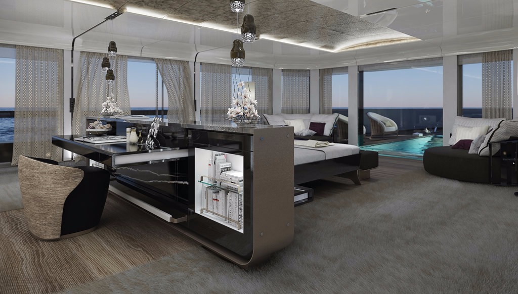 An unusual for a yacht design addition is featured on board Auoda: the owner’s suite benefits from a private deck area with a 5m pool with a waterfall, which flows from a luminous glass column.