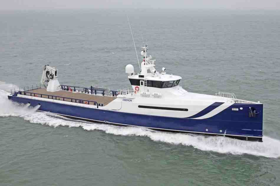 The 50-metre SEA AXE is equipped with a 30-metre open deck with a total working area of 230 square metres and 250 tonnes of deck-cargo capacity. The deck crane has a maximum lifting capacity of 14 tonnes when extended to 10 metres. Capable of crossing the Atlantic at a cruising speed of 18 knots, the SEA AXE 5009 can be configured according to the client’s needs. For example, the standard configuration provides accommodation for a maximum 12 crew and staff, although it is possible to provide accommodation for additional staff with a customised layout. Amels Press Release: ‘OBERON’ changes the support vessel market