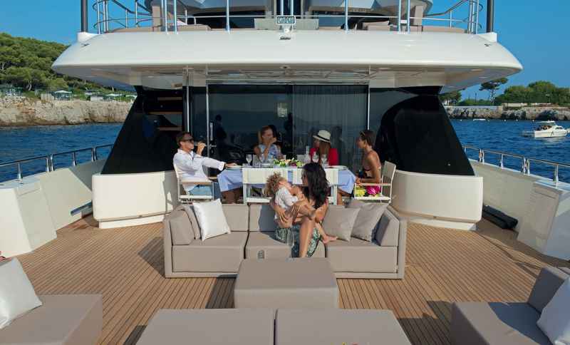 The convertible aft deck, with oversized modular sofas, will stow a 6.50m diesel powered SACS tender while two 3-seater personal water-crafts, 2 Seabobs and one JetLev will be stored in the transom garage. An additional stand-up JetSki will be installed on the deck, right under the 1.5 ton capacity Opacmare crane.
