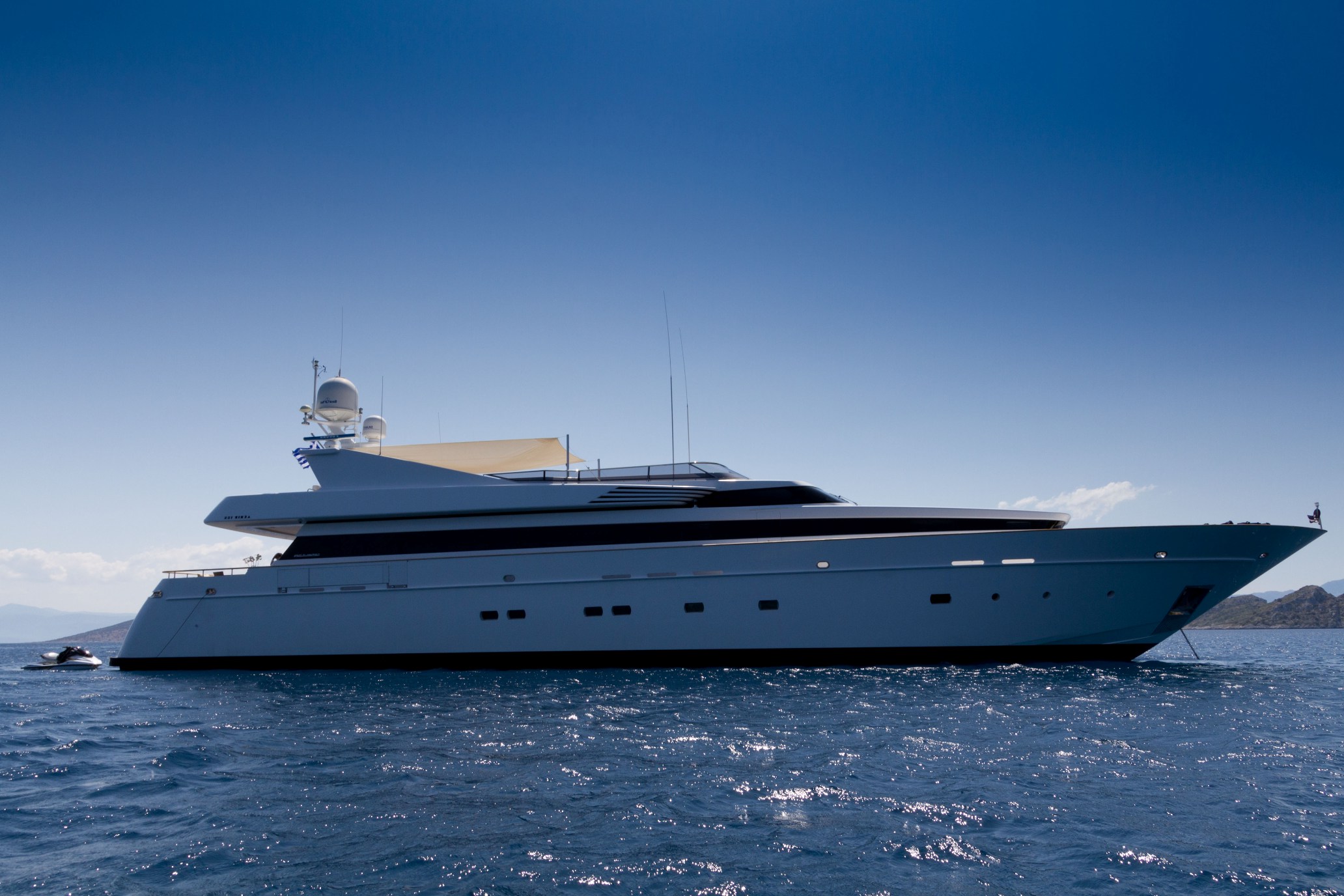 Originally built as a “shadow” boat for the King of Qatar’s yacht, charter yacht Mabrouk is a 38,30m vessel built by Cantieri di Pisa with a very modern and contemporary design and décor, yet very elegant, with touches of whimsy. Although built in 2004 her amenities include colour-changing Spa Pool showers and other modern features found aboard yachts built more recently. Her fantastic layout is perfect for entertaining and she is incredibly spacious throughout. She is an excellent choice for couples wanting to embark on a Greek charter holiday, with luxurious accommodation offered in 5 superior cabins. Mabrouk is a high volume yacht cruising very well at 24 up to 28 knots.