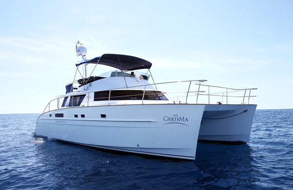 Accommodation aboard is provided in 3 lovely en-suite cabins to 6 charter guests in total. The interior is elegant, with warm wood panels, soft neutral furnishings and fine attention to décor detail. In the saloon, guests can dine in elegance or unwind on the supple leather soft furnishings. The vessel also boasts vast exterior living over her wide 6.5 m multi-hull design. The guest cockpit boasts an al-fresco dining table and seating for 6, shaded by an overhead bimini cover. The foredeck is perfect for sunbathing, with plenty of open deck space, whereas the flybridge is ideal for entertaining and further al-fresco dining. The yacht also features an extended swim platform for effortless water access. More about charter yacht The Chrisma …