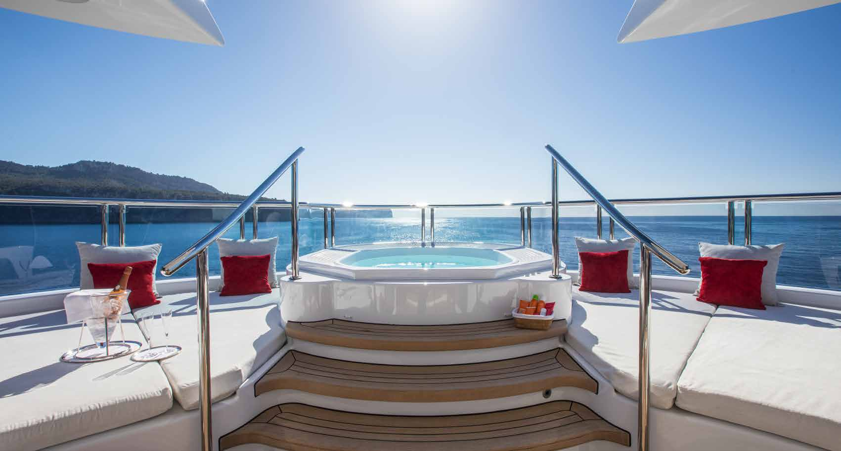 Whether hosting a special event in Monaco or spending days slipping from one incredible beach on Corsica to the best water sports sites around Sardinia, the outdoor areas are flexible and designed with the height of comfort in mind: Lounge beside the water within the beach club, dine alfresco at the grand bridge deck aft table while taking in panoramic views of your surroundings, entertain from the sofas along the aft and savour a variety of cocktails from the bar, or party at sundown on the sundeck and dip into the Jacuzzi for a night under the stars.
